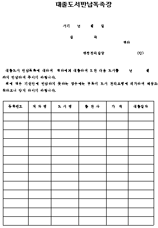 대출도서 반납독촉에 대하여 귀하에게 대출하여 드린 다음 도서를 년 월 일까지 반납하여 주시기 바랍니다.