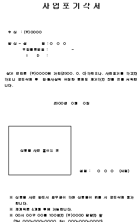 상기 본인은 (주)OOOO에 가입(20OO. O. O)하였으나, 사업포기를 하고자 하오니 코드삭제 후 민․형사상의 어떠한 문제도 제기하지 않을 것을 서약합니다.