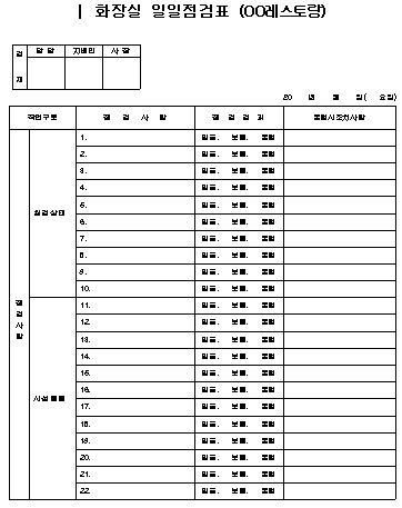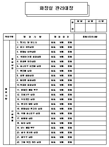 | 화장실 일일 점검표 양식 (0) | 2019.08.24 |