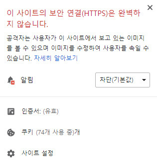주의 요함 문구는 사라졌지만 주소 왼쪽에 자물쇠 아이콘 대신 ⓘ이런 모양의 아이콘(information)은 계속 보인다. 클릭해 보면 사이트 설정과 인증서에 관한 안내가 나온다. 사이트 보안을 했지만 크롬이 이 인증서를 완전히 신뢰하지 않는다는 의미다. 그건 티스토리에서 사용한 인증서와 크롬(구글)간에 해결을 봐야 할 문제다. 윈도우 사용자는 인증서 관리에서 티스토리의 인증서를 신뢰하겠다고 설정하는 방법이 있긴 하지만 모든 방문자가 그런 설정을 할 수 없으니 그냥 이렇게 무시하고 사용하는 수밖에 없다.