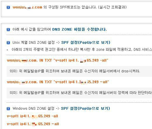나의 SPF 레코드는 "v=spf1 ip:1.***.65.249 -all"와 "v=spf1 ip:1.***.65.249 ~all" 두 종류가 있다. 눈썰미 좋은 사람은 쉽게 다른 부분을 찾아 냈겠지만 all 앞에 "-"와 "~"의 차이가 있다. 만약 내 메일 서버를 사칭(조작)해서 메일을 전송하게 되는 불량 사용자가 있을 때 "-"는 메일을 수신하는 측에서 바로 삭제하는 것이고 "~"는 수신측 서버의 설정에 따라서 취급하도록 한다. 둘 중 하나를 선택해서 사용할 수 있다. 어떤 것을 선택하든 스팸 전송이 아니라면 사용하는데는 지장 없다.