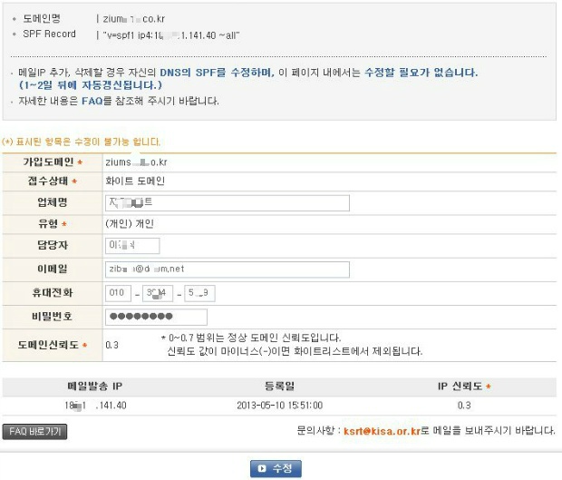 이제 뭘 해야 하면 기다려야 한다. DNS 적용이 빠르면 몇 시간 내에, 적어도 하루가 지나면 nslookup으로 kisarbl.or.kr text = "v=spf1 ip4:10.000.120.4 ~all" 이런식의 등록 내용을 확인 할 수 있다. 다음은 다시 KISA 홈페이지로 이동해서 화이트 도메인 등록신청 페이지로 접속합니다. 도메인과 아이피를 차례로 입력하면 상세 정보를 입력할 수 있는 페이지가 열린다.