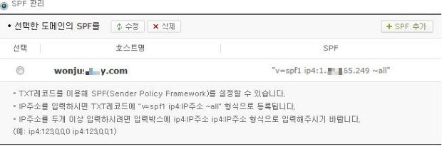 뭔가 알 것 같은 화면이다. KISA 홈페이지에서 방금 확인했던 SPF 레코드를 입력하는 부분이다. SPF 입력 부분에 위에서 봤던 ip4:1.***.65.249 이 부분을 입력하면 된다. ip4:와 아이피가 추가 된다.
