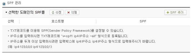 SPF 관리를 체크하면 위의 레이어가 펼쳐진다. 상단 우측의 +SPF 추가 버튼을 클릭하면 아래와 같은 팝업이 열린다.