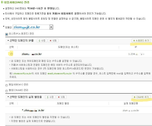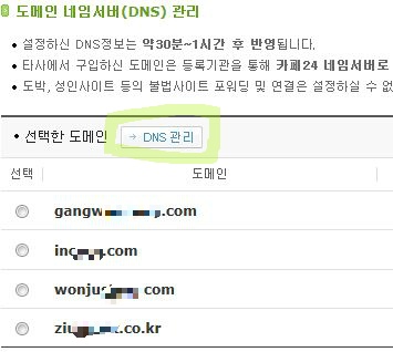 2차도메인을 설정 할 도메인을 선택 한 후에 →DNS 관리 버튼을 클릭한다. 이미지에는 없지만 mydomain.com을 선택했다고 가정해 보자.