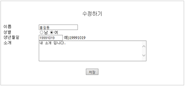 modify.php의 화면이다. test.html과 비슷하지만 기존에 저장 된 값이 기본 값으로 들어가 있다. 여기서 수정하고 싶은 항목을 수정하고 저장을 버튼을 클릭하면 submit이 실행 된다.