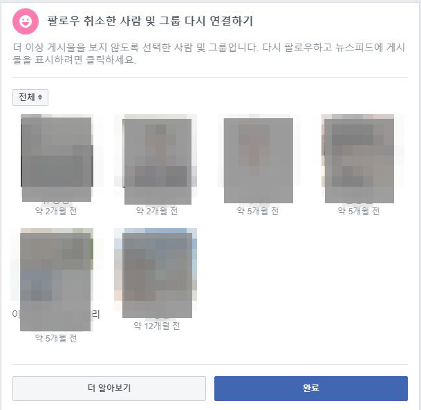 내가 언팔한 사람과 그룹, 페이지 목록이 보인다. 프로필 사진을 클릭하면 다시 팔로우가 되고 한 번 더 클릭하면 다시 언팔 된다.