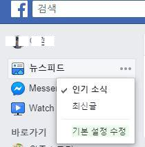 페이스북 홈에서 내 이름 아래에 보면 뉴스피드 메뉴가 있고 옆에 점 세개짜리 메뉴 버튼이 있다. 클릭하면 아래에 "기본 설정 수정"이라고 있다.