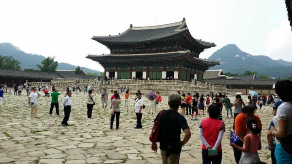 그리고 궁 내에 현대식 유리 건물의 커피숍은 어울리지 않는 거 같습니다. 제가 경주에도 가보고 전주에도 가봤는데 그 곳의 특징은 유적지 내에 어쩔 수 없이 필요한 상업시설이 들어서게 되면 문화재와 어울리도록 건물을 짓는데 서울은 왜 그렇게 하지 못한 것일까요? 일행들 모두 땀을 뻘뻘 흘리면서 두 시간 넘게 궁을 돌아 다시 광화문으로 나왔습니다. 경복궁 안에서 밖을 바라봤을 때의 풍경은 마치 일제가 총칼로 조선을 유린했던 역사의 장면을 재현해 놓은 듯 했습니다. 그 위협적인 고층 빌딩들을 보고 있으니 우리나라의 처해 있는 현실이 많이 아팠습니다.