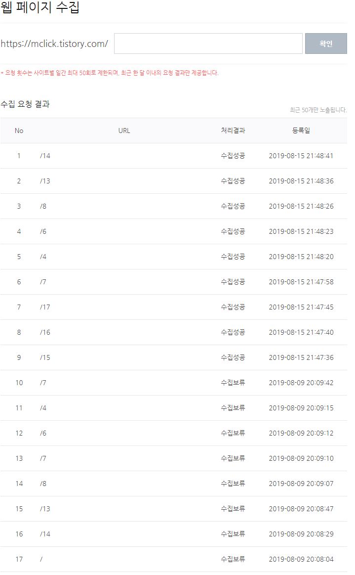 여담이 길었는데 위에 네이버 웹마스터도구에서 "수집보류"라고 돼 있는 걸 보고 찝찝했다면 그냥 재시도 하면 된다. 첨부한 이미지를 보면 8월9일 수집 요청해서 수집보류가 나자 별다른 작업 없이 며칠 뒤에 다시 수집요청하니 1분도 안 되서 바로 수집성공으로 바뀐다.