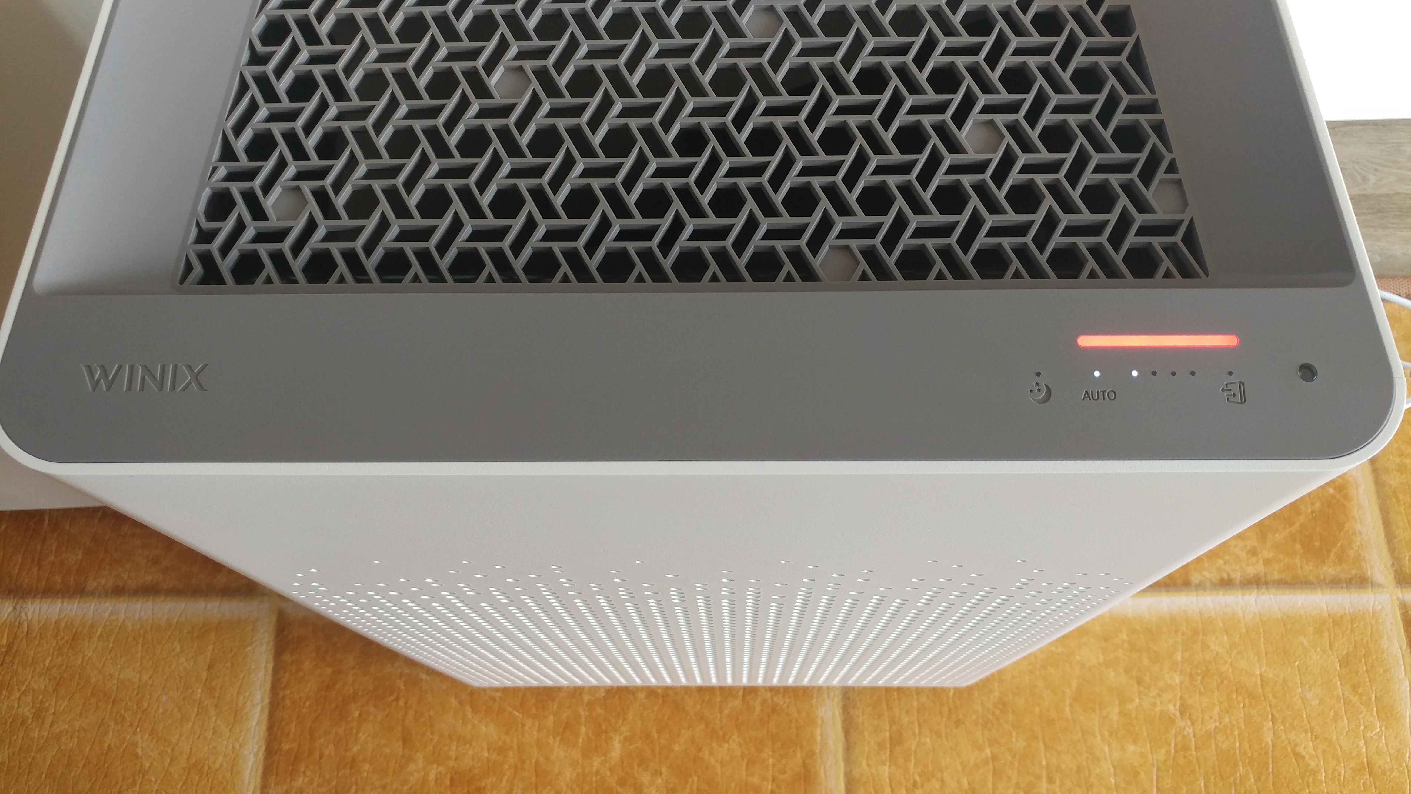 상단에 표시등이 있는데 파란색은 공기질 좋음, 주황색은 보통, 빨간색은 나쁨입니다. 먼지가 조금만 날려도 빨간색으로 바뀝니다.