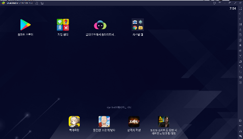 블루스택 화면입니다. 안드로이드 환경이기 때문에 이 안에서 구글 플레이를 이용 할 수 있습니다. 화면 왼쪽 상단에 구글 플레이 아이콘이 보입니다. 클릭하면 앱이 실행됩니다.