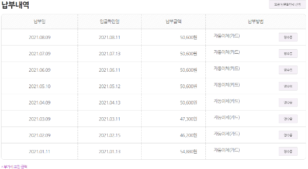 첫 달엔 중간에 가입했으니 이용료를 날짜별로 계산한 것과 출장비가 포함 된 금액이 결제 됐고 그 뒤로 4만7천원 두 번 그 후로는 계속 5만6백원이 결제되고 있습니다. 실제로 사용하지도 않는 서비스에 가입되서 생돈을 날리고 있는 중입니다.