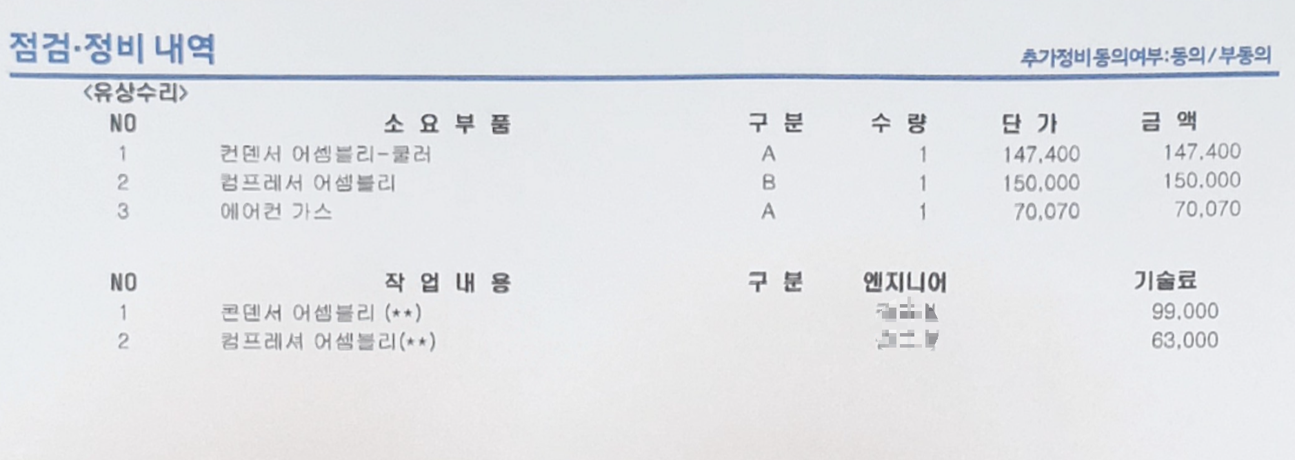 요즘 같은 폭염에 에어컨이 고장 났으니 그냥 타고 다닐 수도 없고 해서 응급하게 수리를 했는데 총 58만 원 나왔습니다. 컴프레셔는 정품이 아니고 호환제품이라 부품 값이 조금 내려갔습니다. 현대 블루핸즈에서 수리한 단가입니다. 다른 사례들과 비교해 보면 다소 가격이 높게 책정 된 거 같지만 지금 한창 폭염이고 해서 그냥 수리 했습니다. 시간 여유가 있다면 다른 정비소와 비교 견적을 해 보는 게 좋을 거 같습니다.