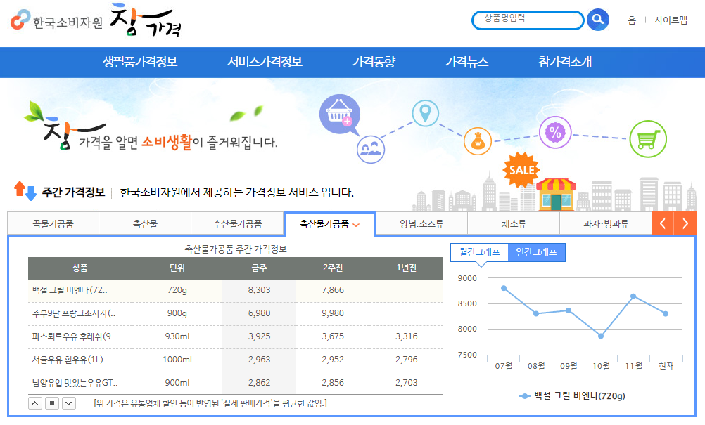 한국소비자원에서는 사이트를 통해 우리 생활에 꼭 필요하고 소비해야 하는 제품들의 가격 정보를 제공하고 있습니다.
