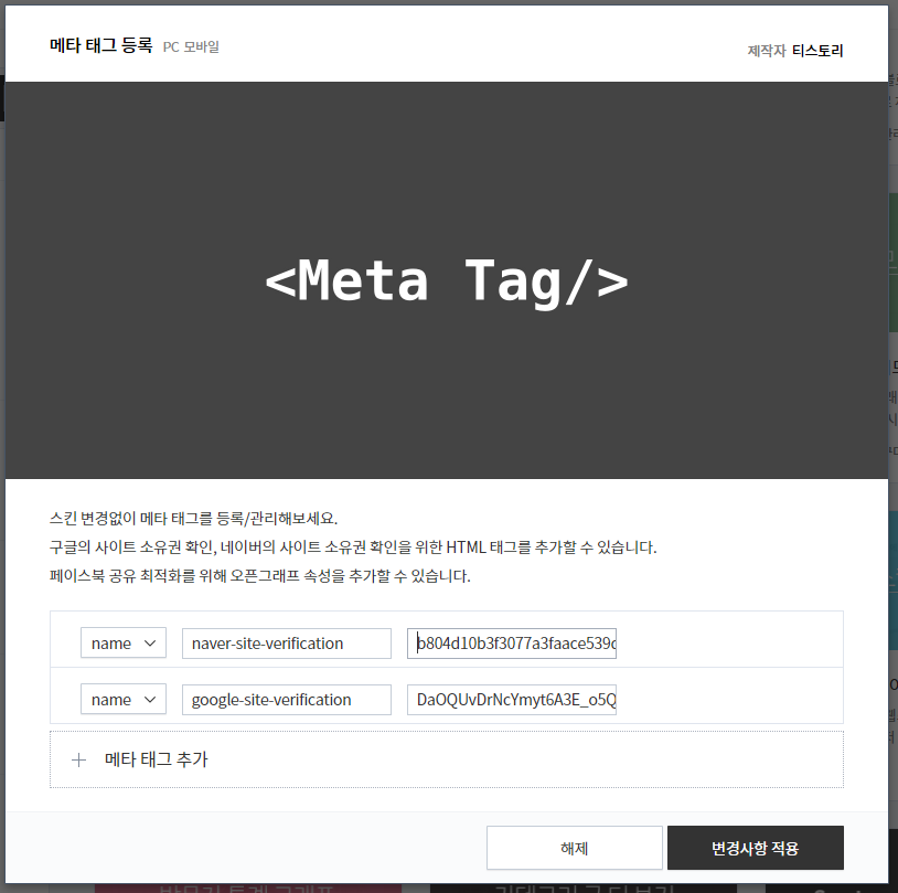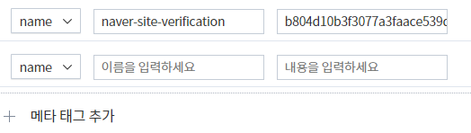 "+ 메타 태그 추가"를 클릭하면 입력 항목이 추가 됩니다.