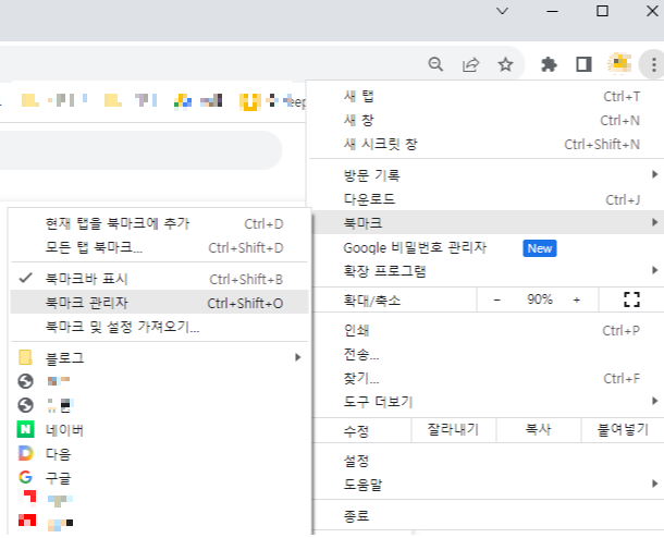 먼저 크롬의 맨 오른쪽 상단에 점 세 개 아이콘을 클릭한 다음 "북마크 → 북마크바 표시"를 선택합니다.