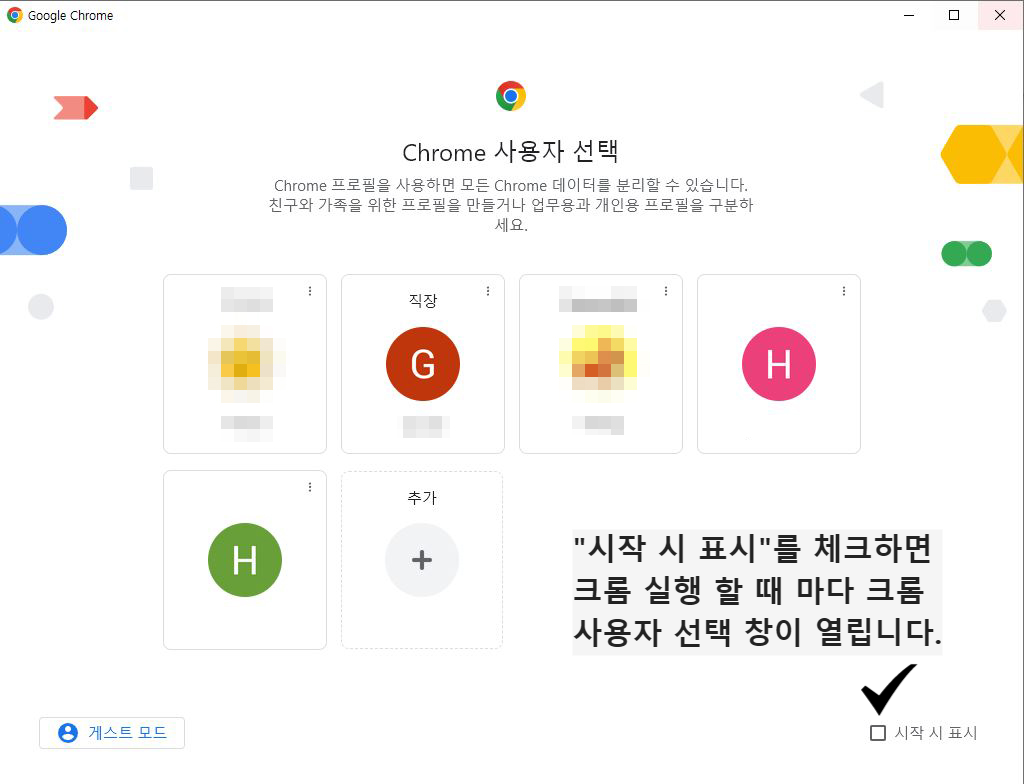 크롬이 조금 늦게 업그레이드 된 사용자 중에 어느 날 갑자기 이렇게 사용자 선택 창이 열려서 당황했던 분도 있을지 모르겠습니다. 멀티 계정 사용자는 크롬 시작 시 이 창이 열립니다. 창 하단 오른쪽에 체크 해제하면 다음 부터는 열리지 않습니다.