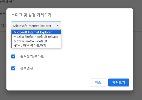 "북마크 관리자"가 아닌 "북마크 및 설정 가져오기"를 하게되면 "이미지 14"에서 처럼 IE나 파이어폭스 등 설치 된 다른 브로우저의 즐겨찾기와 설정 정보를 가져 올 수 있지만 크롬에서 크롬의 설정 정보를 불러오는 기능이 없습니다.