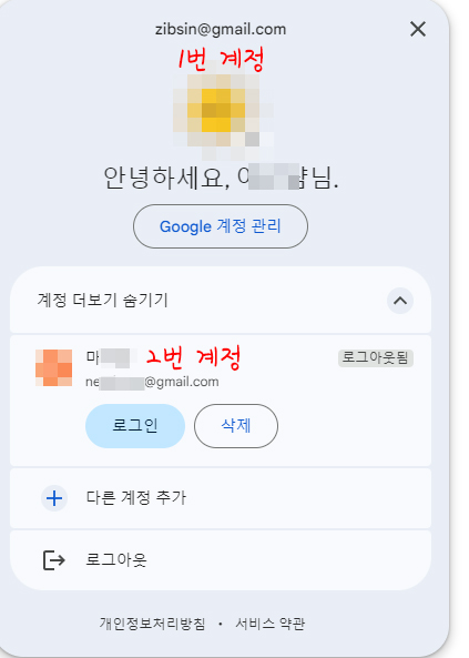 2번 계정은 멀티 계정을 설명하기 위해 생성한 계정입니다. "+다른 계정 추가"를 클릭하면 계정을 계속 만들 수 있습니다.