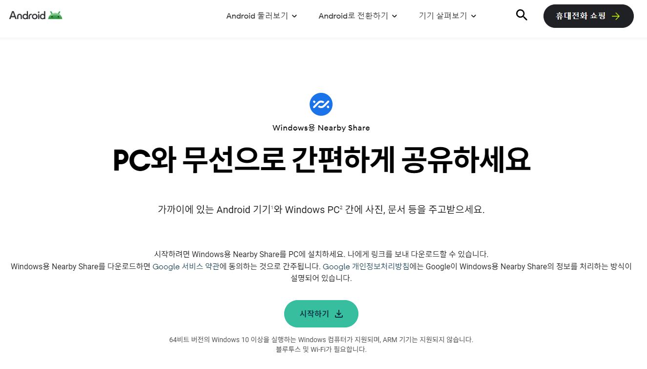 PC(노트북)에서 안드로이드 홈페이지에 접속해 Nearby Shware 프로그램을 다운로드하고 설치하세요. "시작하기 ↓" 버튼 클릭을 클릭하세요. 링크는 포스팅 아래에 있습니다.