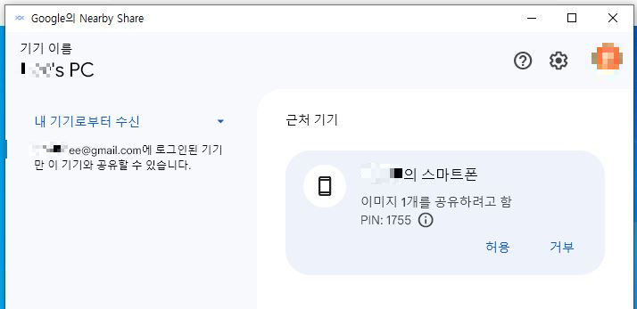 PC에서 Nearby Share 화면에 스마트폰에서 보낸 파일을 받을 것인지 확인합니다. "허용"하면 파일이 전송됩니다. 여러 파일을 동시에 전송 할 수 있습니다.