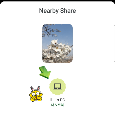 Nearby Share 버튼을 터치하면 내 근처 기기 목록이 보이는데 저는 제 PC 이름이 하나만 보입니다. 해당 PC 아이콘이나 PC 이름을 터치합니다.