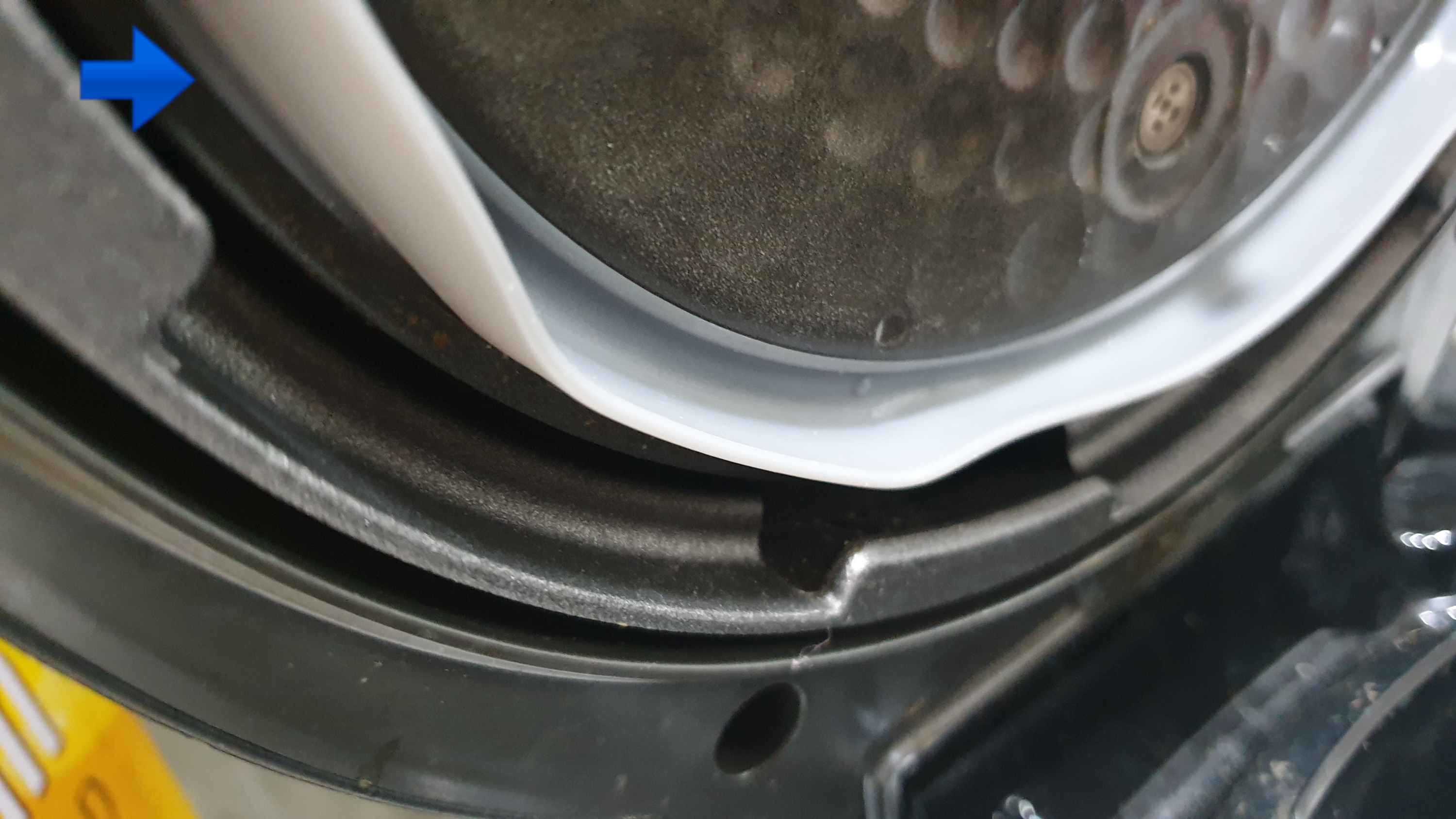 포커스가 나가서 잘 안 보이는데 파란색 화살표 부분, 그러니까 압력 고무패킹의 바깥쪽 테두리를 보면 밥솥 뚜껑에 단단히 고정되도록 작은 돌기가 있습니다. 저 돌기가 보이면 안 됩니다. 끼우기가 좀 어려운데 저는 젖가락으로 쿡쿡 찌르면서 넣으니 잘 들어갔습니다.