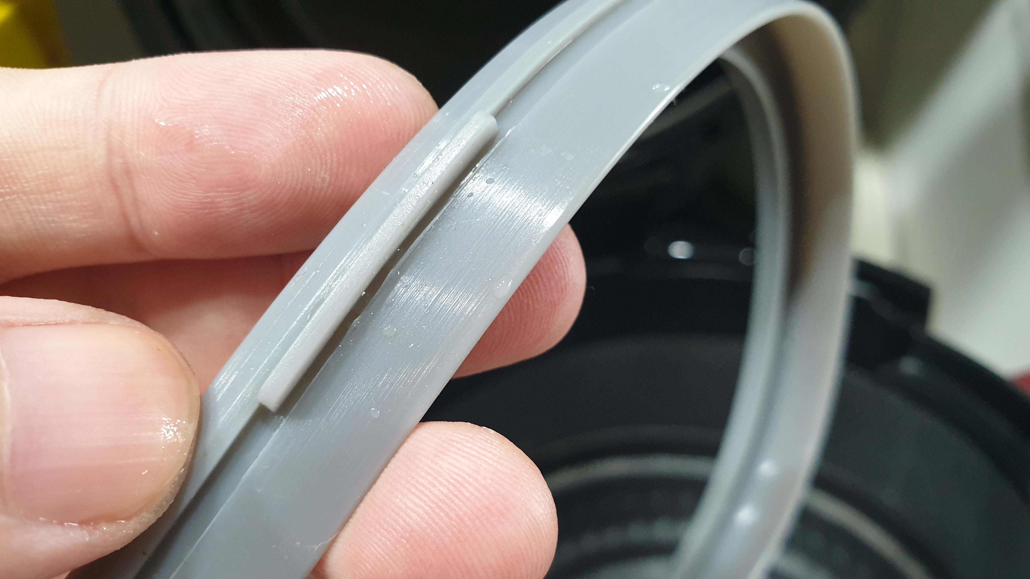 고무패킹과 밥솥 뚜껑 테두리를 잘 보면 돌기와 홈이 있습니다. 이 틈을 잘 맞춰야 합니다. 제대로 안 맞추면 끝가지 패킹을 끼울 수 없습니다.