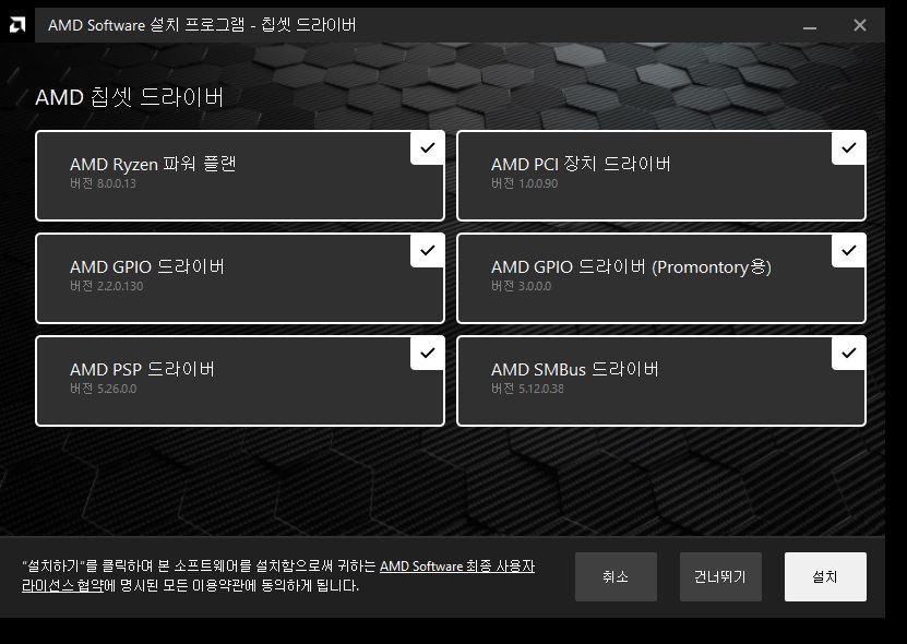내 PC에서 사용하고 있는 AMD 제품들 드라이버입니다. 필요한 것만 선택하면 되는데 저는 모두 선택했습니다.