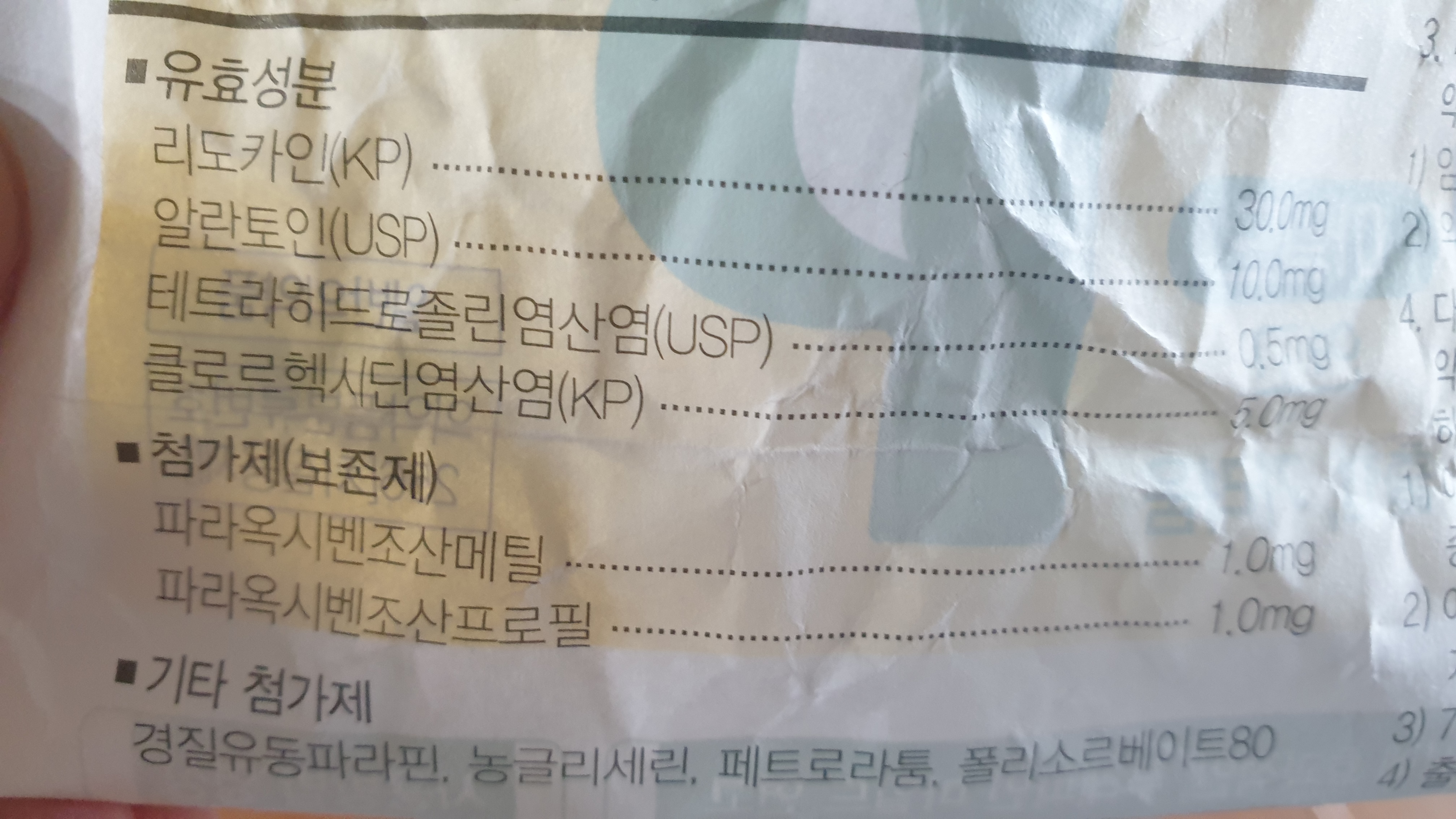 유효성분을 보니 리도카인, 알란토인, 테트라히드로졸린염산염, 클로르헥시딘염산염이 있다는데 리도카인 말고는 들어 본 적도 없는 성분이다. 첨가제인 파라옥시벤조산메틸, 파옥시벤조산프로필은 다른 피부 연고에도 들어 있는 성분이었다. 평소에 팔, 다리, 몸에 가려움증이 있어 피부연고를 자주 사용하는데 원하는 브랜드 약이 없을 땐 성분을 보고 구입하기도 한다.