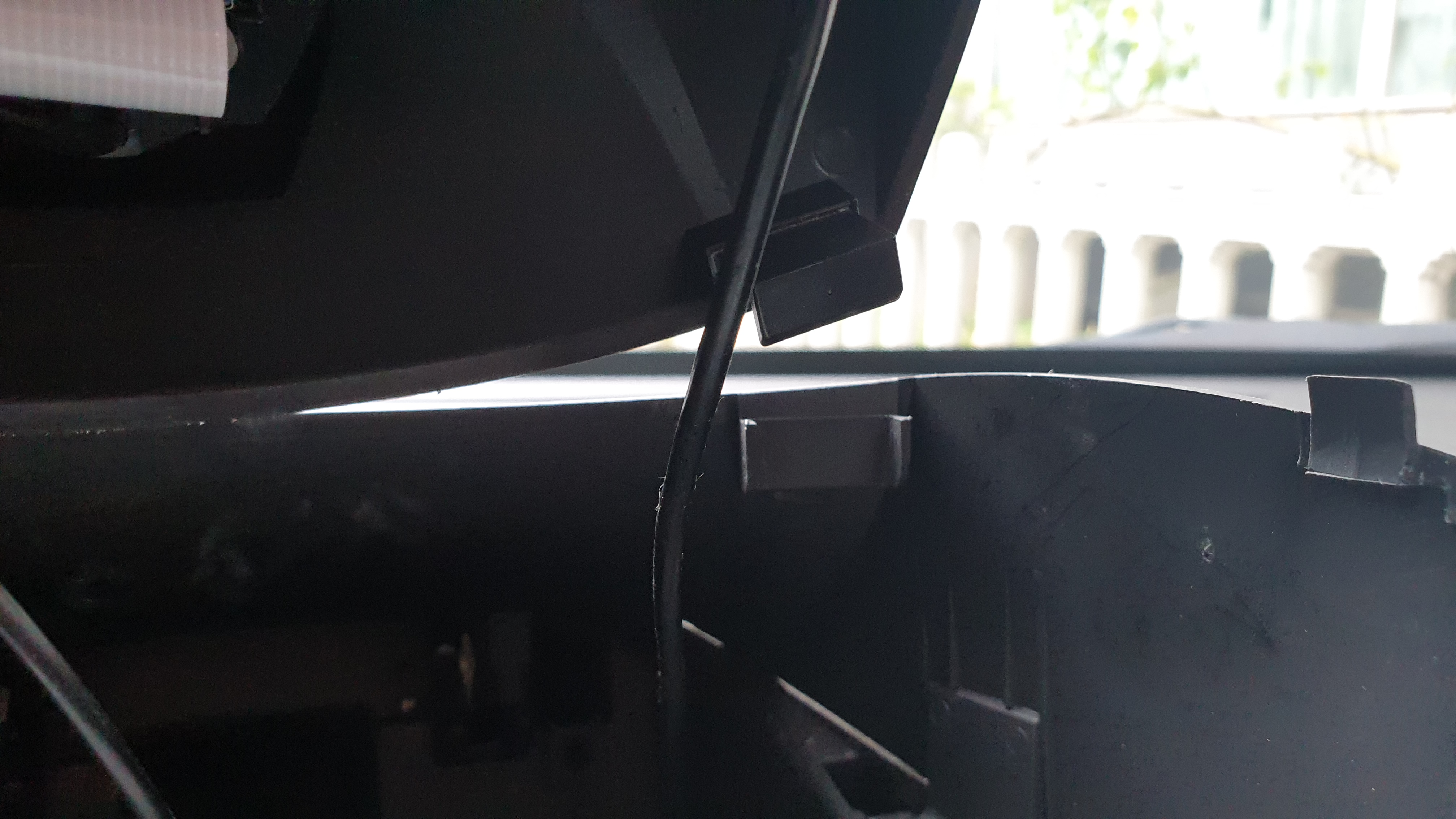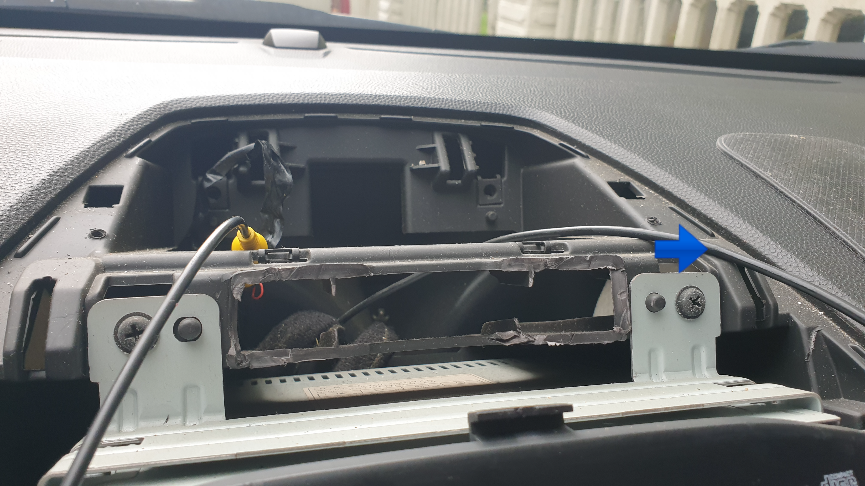 작업을 위해 바깥쪽 마감재까지 분리했습니다. 선 두 개가 보입니다. 왼쪽 노란색 잰더가 붙어있는 건 후방카메라 연결 선입니다. 오른쪽은 파워(전력) 선입니다. 내비에는 일단 이렇게 두 개만 연결하면 사용 가능합니다.