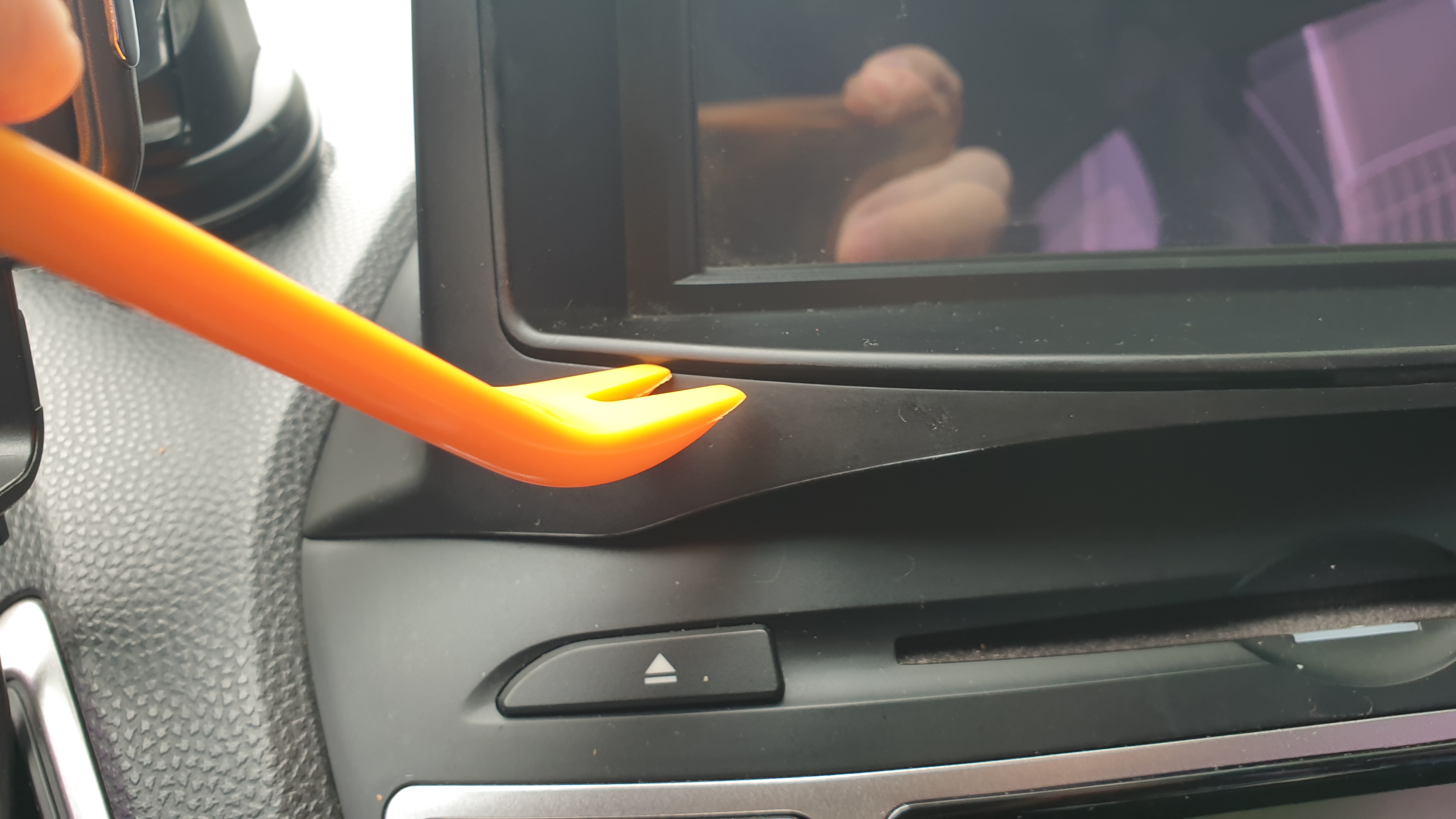 내비게이션 마감재는 바깥쪽 몸체와 안쪽 내비게이션 거치대가 두 개로 분리 돼 있습니다. 내비게이션이 붙어있는 거치대 아래쪽으로 헤라로 살짝 밀듯이 위로 올리면 따깍하고 쉽게 열립니다. 너무 힘주지 말고 살살 양쪽 하단 사이드를 공략해 보세요.