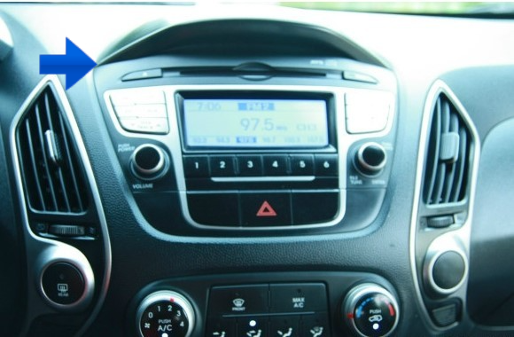 내비게이션이 설치되지 않은 투싼ix의 센터페시아 모습은 이렇습니다. 상단에 내비게이션을 설치하게 되는데 파란색 화살표 부분처럼 덮게 앞쪽 양 사이드 쪽을 헤라로 공략하면 딸깍하고 덮게가 열립니다. ㄱ모양의 후크가 좌우중간에 세 개 있습니다. 고정 된 게 아니기 때문에 잘 열립니다.