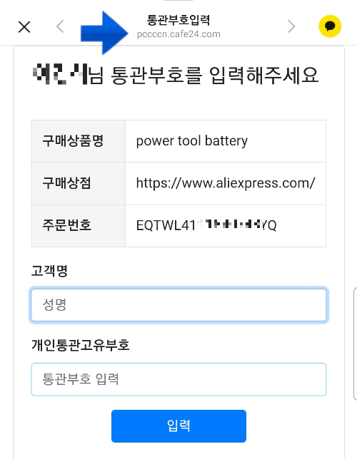 일단 카카오톡에서 인증 된 계정이라고 하니 통관부호 입력창을 열어본다. 메시지 상단에 pccccn.cafe24.com이라는 URL 보인다. 주소 부터가 업체에서는 잘 사용하지 않는 패턴이 수상하다.