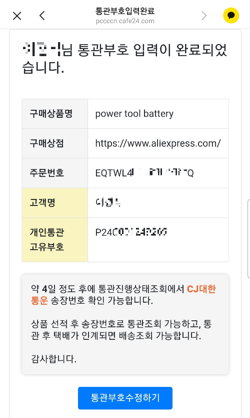 알리 판매자는 나에게 이미 통관번호를 보내 달라는 메시지를 보냈고 나는 그것을 무시했다. 그리고 시간이 지나서 국내 통관대행 업체에로 위탁 됐던 것이다. 이런 사실을 알고 나서야 아몽마마가 보낸 카톡 메시지를 열어 통관번화를 입력했다.