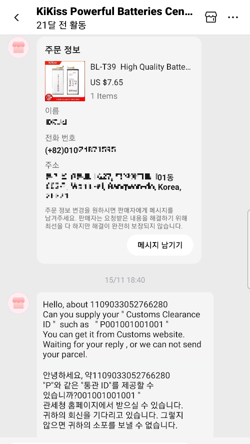 사용하던 스마트폰의 배터리가 고장나면서(부풀어오름) 새로 구입하고 사용하던 폰은 배터리만 교체해서 다른 용도로 사용하려고 알리익스프레스에서 주문했다. 각격은 만원 남짓. 그런데 보통 알리에서 아무리 배송이 늦어도 2, 3일이면 판매업체에서 배송을 시작하는데 이번엔 1주일이 지나도 배송현황 안내가 없다. 평소에도 전자기기는 안전성 조사 때문에 며칠 늦는 일이 있어서 그런가 보다 했다. 기다리고 있는데 카카오톡으로 "아몽마마"라는 곳에서 통관번호를 입력해 달라는 메시지가 왔다.